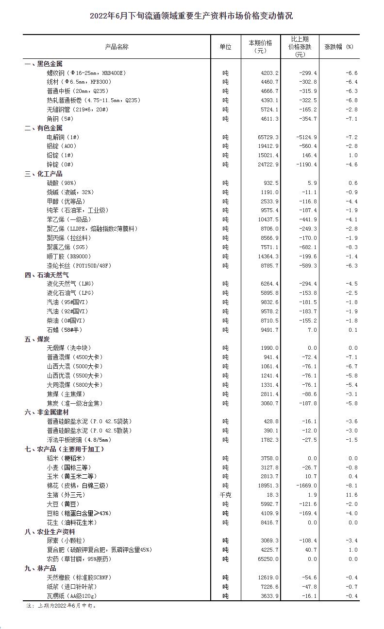 中新網(wǎng)7月4日電 國(guó)家統(tǒng)計(jì)局網(wǎng)站4日公布2022年6月下旬流通領(lǐng)域重要生產(chǎn)資料市場(chǎng)價(jià)格變動(dòng)情況。據(jù)對(duì)全國(guó)流通領(lǐng)域9大類(lèi)50種重要生產(chǎn)資料市場(chǎng)價(jià)格的監(jiān)測(cè)顯示,2022年6月下旬與6月中旬相比,6種產(chǎn)品價(jià)格上漲,40種下降,4種持平。其中,生豬(外三元)價(jià)格報(bào)18.3元/千克,環(huán)比上漲11.6%。(中新財(cái)經(jīng))