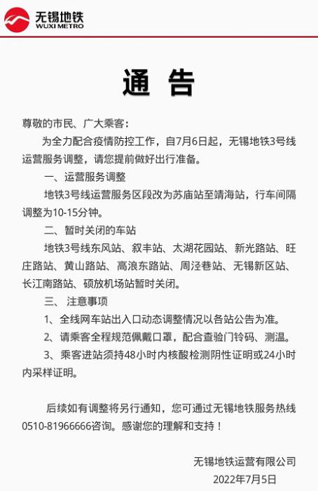 地鐵3號(hào)線東風(fēng)站、敘豐站、太湖花園站、新光路站、旺莊路站、黃山路站、高浪東路站、周涇巷站、無錫新區(qū)站、長江南路站、碩放機(jī)場(chǎng)站暫時(shí)關(guān)閉。