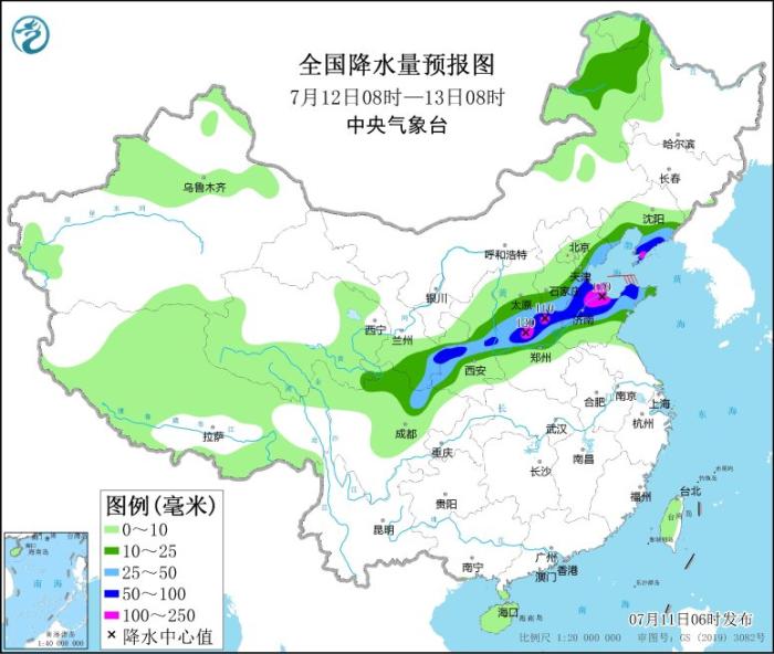 7月11日08時至12日08時,甘肅南部、陜西中北部、內蒙古河套地區(qū)、西北地區(qū)東部、山西、河北中南部、北京南部、天津、山東中北部、河南西北部、四川盆地西北部等地有中到大雨,其中,甘肅東南部、內蒙古河套地區(qū)、陜西北部、山西中北部、河北南部、山東中部和西北部等地的部分地區(qū)有暴雨或大暴雨(100~130毫米)。新疆南疆盆地部分地區(qū)有4~6級風。南海南部海域將有5~6級、陣風7級的偏西到西南風。