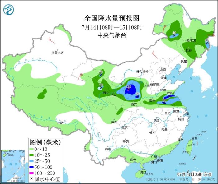 7月14日08時至15日08時,西北地區(qū)東部、江蘇北部、安徽北部等地部分地區(qū)有大到暴雨,其中,甘肅東部、陜西北部等地局地有大暴雨(100~120毫米)。內(nèi)蒙古東北部和中部、黑龍江東北部、新疆沿天山地區(qū)等地部分地區(qū)有4~6級風。