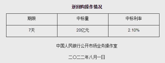 央行8月1日開展20億元逆回購操作 中標(biāo)利率2.10%