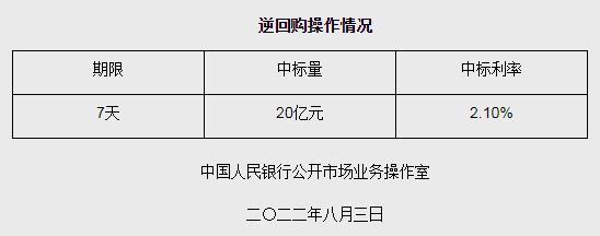 中新網(wǎng)8月3日電 據(jù)中國人民銀行網(wǎng)站消息,為維護(hù)銀行體系流動性合理充裕,2022年8月3日中國人民銀行以利率招標(biāo)方式開展了20億元逆回購操作,期限為7天,中標(biāo)利率2.10%。(中新財經(jīng))
