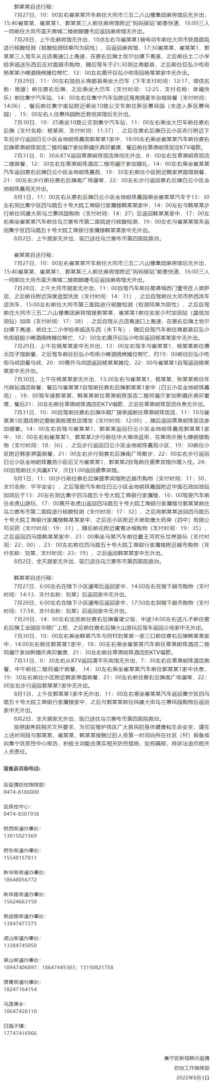 2022年8月2日,內(nèi)蒙古烏蘭察布市集寧區(qū)在居民“愿檢盡檢”中發(fā)現(xiàn)一管混檢異常樣本,隨即對所有混檢人員進(jìn)行單采單檢,其中大同市前來集寧區(qū)人員郭某某為初篩陽性,同時對郭某某同行同住人員進(jìn)行核酸檢測,同行同住人員崔某某、韓某某為初篩陽性,目前此3例初篩陽性人員均已轉(zhuǎn)運(yùn)至定點(diǎn)救治醫(yī)院,現(xiàn)將3人的行程軌跡公布如下: