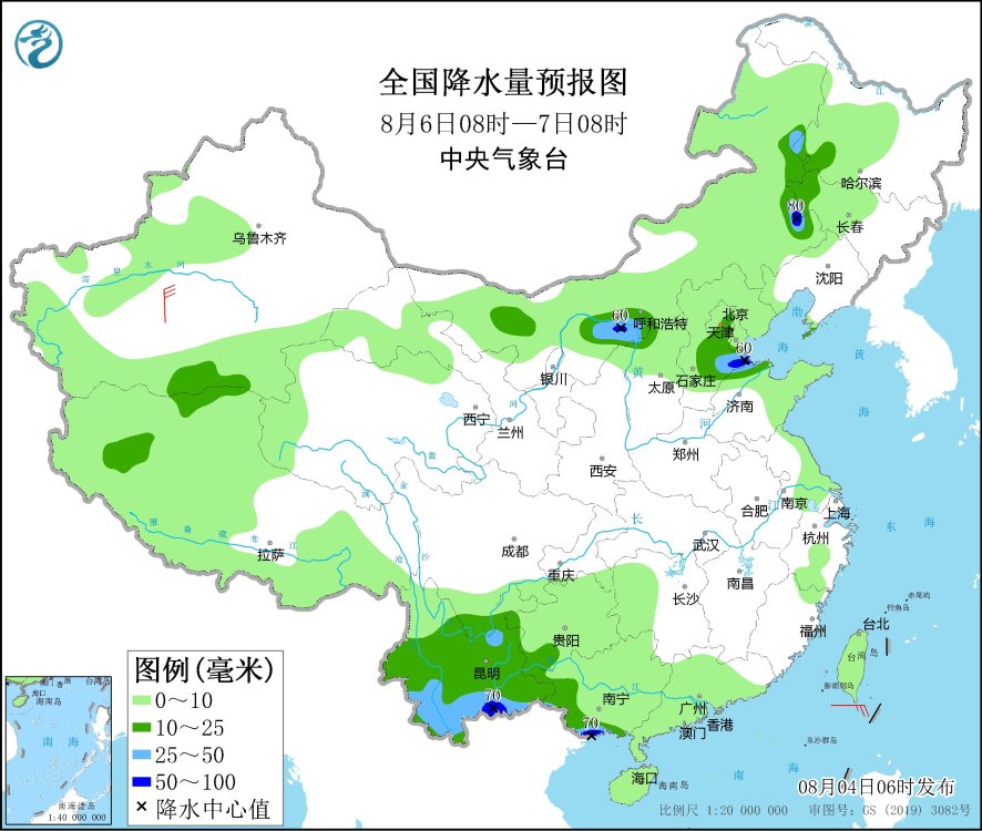 8月6日08時(shí)至7日08時(shí),陜西北部、內(nèi)蒙古河套地區(qū)和東北部、吉林西部、黑龍江西南部、北京東部、河北中部、天津南部、山東北部、廣西西南部、云南大部等地部分地區(qū)有中到大雨,其中,內(nèi)蒙古東南部、河北東部、山東北部、廣西西南部、云南南部等地局部地區(qū)有暴雨(50~80毫米)。新疆南疆盆地部分地區(qū)有5~6級風(fēng)。