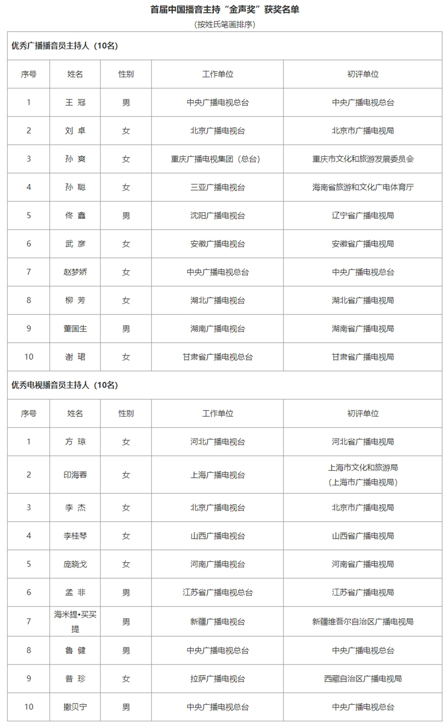 中新網(wǎng)8月8日電 據(jù)國家廣播電視總局網(wǎng)站消息,中國電視藝術委員會8日公布首屆中國播音主持“金聲獎”獲獎名單。共有10名優(yōu)秀廣播播音員主持人、10名優(yōu)秀電視播音員主持人獲獎,其中包括中央廣播電視總臺的撒貝寧,以及江蘇省廣播電視總臺的孟非等人。