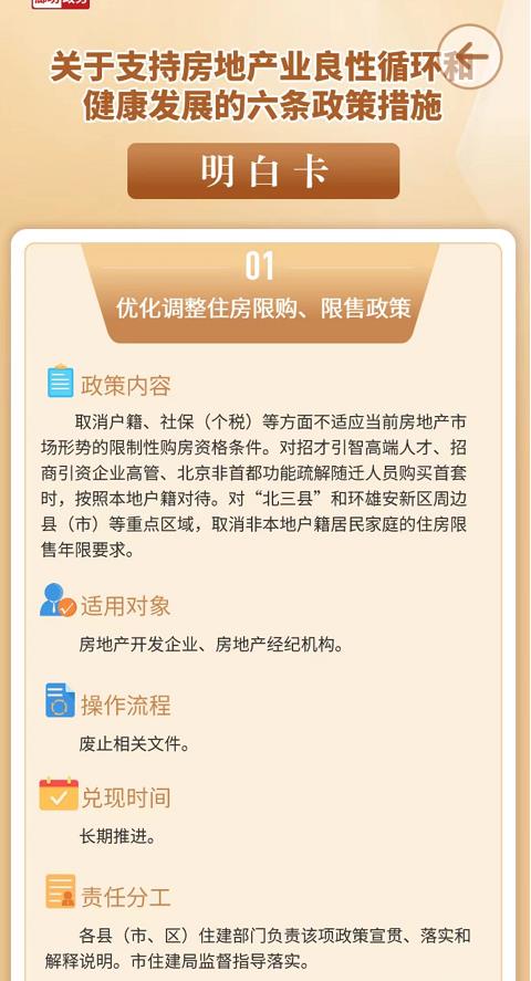 根據(jù)政策明白卡,廊坊優(yōu)化調(diào)整住房限購、限售政策。取消戶籍、社保(個稅)等方面不適應(yīng)當(dāng)前房地產(chǎn)市場形勢的限制性購房資格條件。對招才引智高端人才、招商引資企業(yè)高管、北京非首都功能疏解隨遷人員購買首套時,按照本地戶籍對待。對“北三縣”和環(huán)雄安新區(qū)周邊縣(市)等重點(diǎn)區(qū)域,取消非本地戶籍居民家庭的住房限售年限要求。