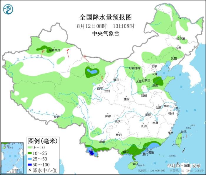 8月12日08時(shí)至13日08時(shí),新疆沿天山地區(qū)、甘肅西部、山東北部、廣東中南部、廣西南部、云南南部等地的部分地區(qū)有中到大雨,其中,云南西南部等地局地有暴雨(50~70毫米)。內(nèi)蒙古西北部、甘肅河西等地部分地區(qū)有4~6級風(fēng),其中,新疆東部部分地區(qū)有7~8級風(fēng)。