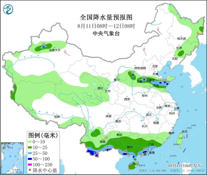 8月11日08時至12日08時,云南南部、廣西南部、廣東西南部沿海以及山西中部、河北南部、山東中部等地部分地區(qū)有大到暴雨,其中,云南南部局地有大暴雨(100~120毫米)。內(nèi)蒙古中東部、新疆東部、云南中南部、廣西南部、廣東西南部沿海、海南島西部等地部分地區(qū)有4~6級風(fēng),局地風(fēng)力可達6~7級。