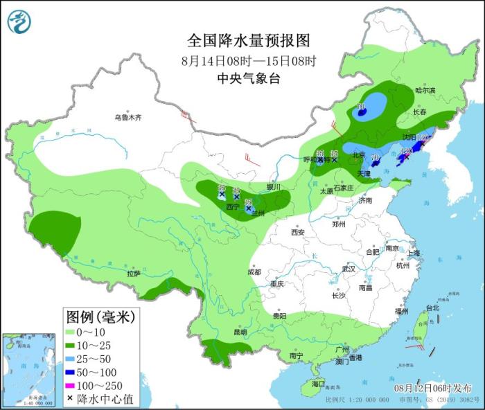 8月14日08時(shí)至15日08時(shí),內(nèi)蒙古東部、青海東北部、甘肅南部、寧夏南部、華北中北部、山東北部、遼寧大部、吉林東南部、云南南部等地部分地區(qū)有中到大雨,其中,遼寧東部和南部、河北東北部等地部分地區(qū)有暴雨,局地大暴雨(100~120毫米)。內(nèi)蒙古中西部、新疆東部等地部分地區(qū)有4~6級(jí)風(fēng)。