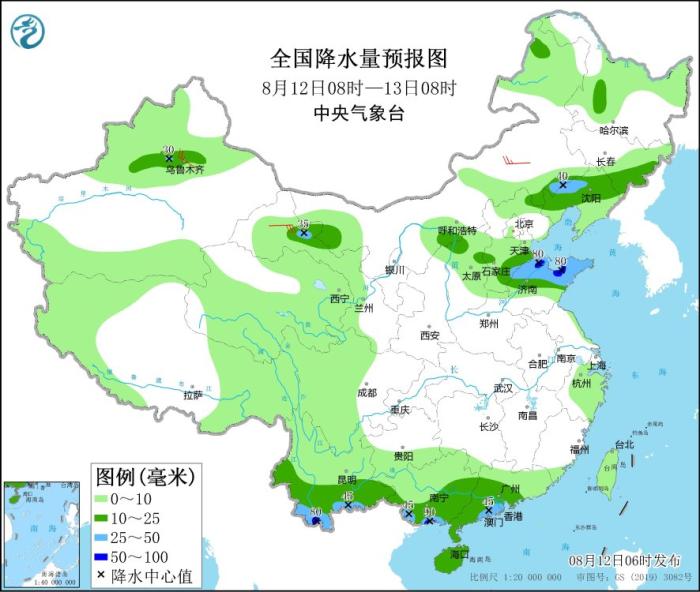 8月12日08時(shí)至13日08時(shí),內(nèi)蒙古東南部、吉林東部、遼寧北部、新疆沿天山地區(qū)、甘肅河西、陜西北部、河北南部、山東中北部、云南南部、華南南部和海南島等地部分地區(qū)有中到大雨,其中,山東北部、云南西南部、廣西南部沿海等地部分地區(qū)有暴雨(50~90毫米)。內(nèi)蒙古中部、甘肅河西等地部分地區(qū)有4~6級(jí)風(fēng)。