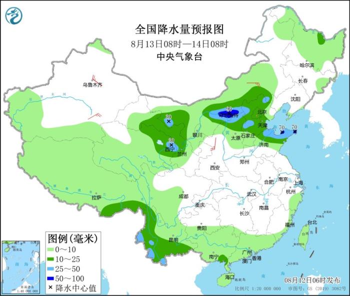 8月13日08時(shí)至14日08時(shí),內(nèi)蒙古中西部、青海東北部、甘肅中部、華北中北部、山東中北部、云南南部等地部分地區(qū)有中到大雨,其中,內(nèi)蒙古中部、山東半島北部等地部分地區(qū)有暴雨(50~90毫米)。內(nèi)蒙古中部、新疆沿天山地區(qū)和南疆盆地等地部分地區(qū)有4~6級(jí)風(fēng)。