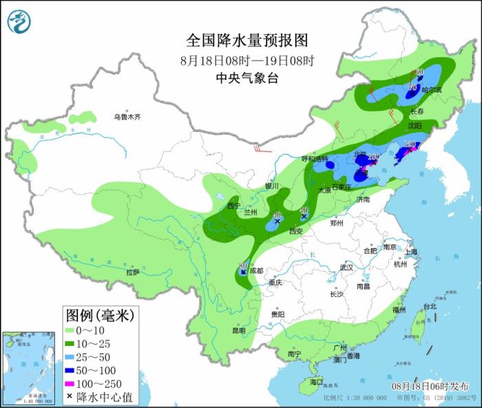 8月18日08時至19日08時,內(nèi)蒙古中東部、黑龍江西南部、吉林西部、遼寧、青海南部、甘肅東部、寧夏、京津冀、山東北部、四川盆地西南部等地部分地區(qū)有中到大雨,其中,黑龍江西南部、吉林西部、遼寧東部和南部、山西北部、河北中北部、北京、天津等地部分地區(qū)有暴雨或大暴雨(100~180毫米)。內(nèi)蒙古中部和西北部、黑龍江西南部等地部分地區(qū)有4~6級風(fēng)。渤海、黃海北部海域?qū)⒂?~5級、陣風(fēng)6級增大到7~8級、陣風(fēng)9級的偏南風(fēng)。