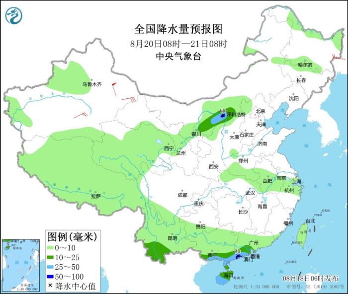 8月20日08時至21日08時,內(nèi)蒙古西部、云南西南部、華南南部和海南島等地部分地區(qū)有中到大雨,其中,內(nèi)蒙古河套地區(qū)、廣東西南部沿海等地部分地區(qū)有暴雨(50~90毫米)。新疆南疆盆地部分地區(qū)有4~6級風(fēng),其中,新疆東部部分地區(qū)有7~8級風(fēng)。
