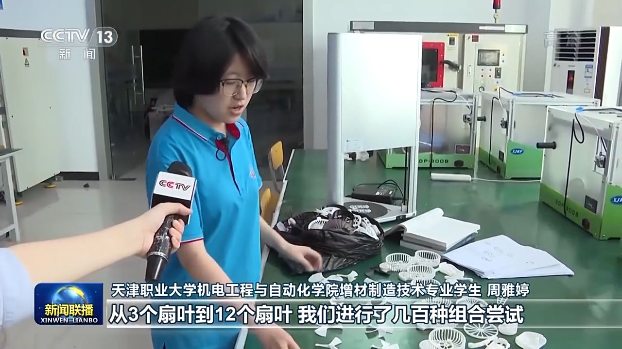 天津職業(yè)大學(xué)機(jī)電工程與自動(dòng)化學(xué)院增材制造技術(shù)專業(yè)學(xué)生 周雅婷:這些都是我們通過3D打印打印出來的,從3個(gè)扇葉到12個(gè)扇葉,我們進(jìn)行了幾百種組合嘗試。如果差0.1毫米的話,可能會(huì)導(dǎo)致風(fēng)扇卡住。