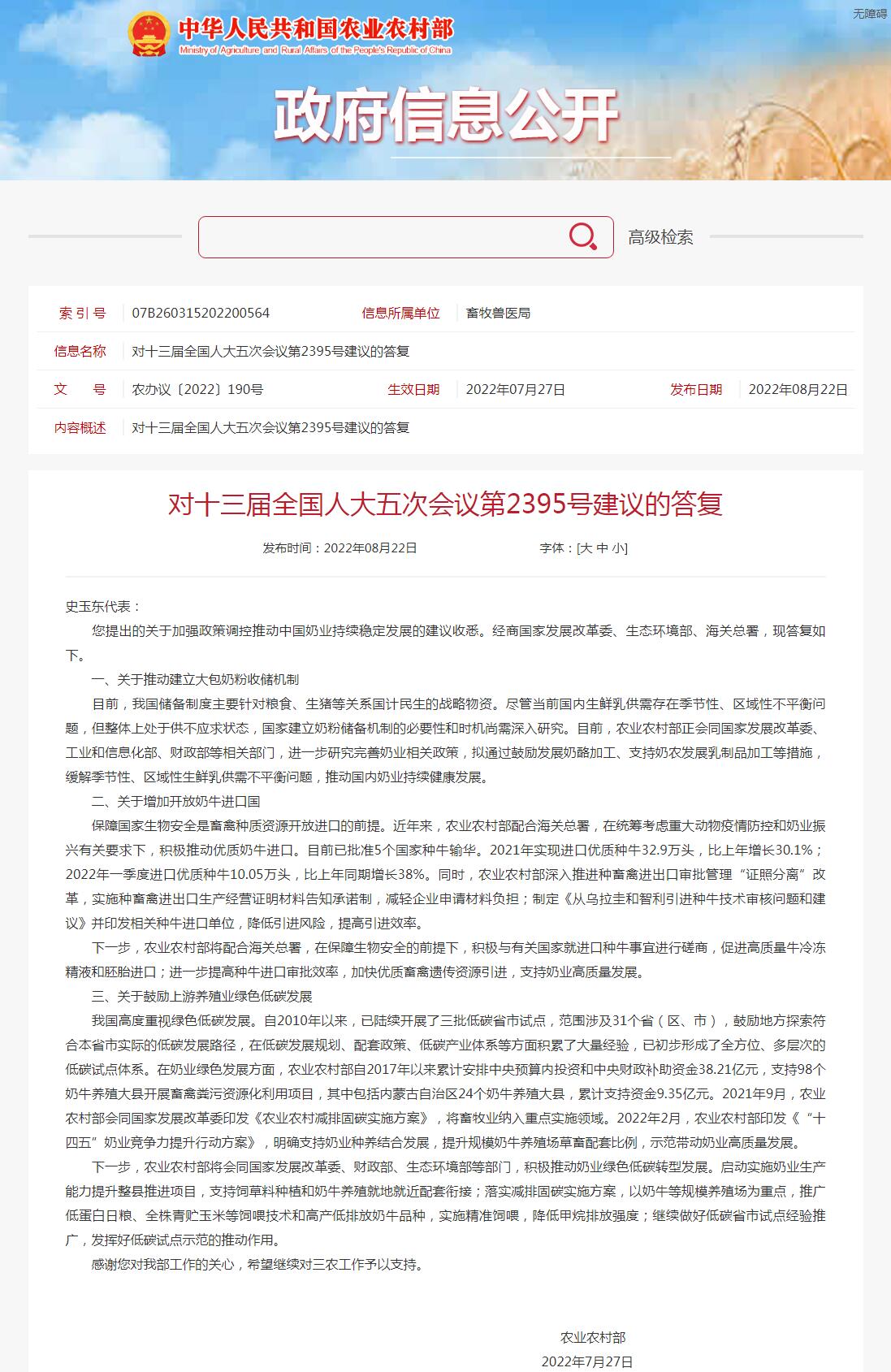 中新網(wǎng)8月23日電 農(nóng)業(yè)農(nóng)村部網(wǎng)站8月22日公布《對(duì)十三屆全國(guó)人大五次會(huì)議第2395號(hào)建議的答復(fù)》。關(guān)于推動(dòng)建立大包奶粉收儲(chǔ)機(jī)制,農(nóng)業(yè)農(nóng)村部在答復(fù)中稱,目前,我國(guó)儲(chǔ)備制度主要針對(duì)糧食、生豬等關(guān)系國(guó)計(jì)民生的戰(zhàn)略物資。盡管當(dāng)前國(guó)內(nèi)生鮮乳供需存在季節(jié)性、區(qū)域性不平衡問(wèn)題,但整體上處于供不應(yīng)求狀態(tài),國(guó)家建立奶粉儲(chǔ)備機(jī)制的必要性和時(shí)機(jī)尚需深入研究。目前,農(nóng)業(yè)農(nóng)村部正會(huì)同國(guó)家發(fā)展改革委、工業(yè)和信息化部、財(cái)政部等相關(guān)部門,進(jìn)一步研究完善奶業(yè)相關(guān)政策,擬通過(guò)鼓勵(lì)發(fā)展奶酪加工、支持奶農(nóng)發(fā)展乳制品加工等措施,緩解季節(jié)性、區(qū)域性生鮮乳供需不平衡問(wèn)題,推動(dòng)國(guó)內(nèi)奶業(yè)持續(xù)健康發(fā)展。(中新財(cái)經(jīng))