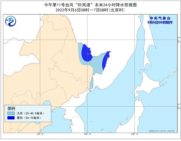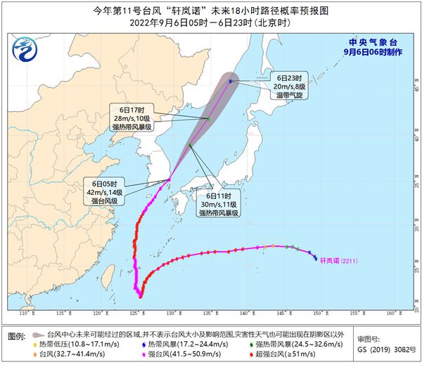 大風(fēng)預(yù)報(bào):9月6日08時(shí)至7日08時(shí),東海東北部、黃海中東部和東南部有6-7級大風(fēng),陣風(fēng)8-9級;我國東北地區(qū)東北部有4-5級風(fēng),陣風(fēng)6-7級,局地8級。朝鮮海峽、日本海大部有8-11級大風(fēng),“軒嵐諾”中心經(jīng)過的附近海面的風(fēng)力有12-14級,陣風(fēng)可達(dá)15-16級。