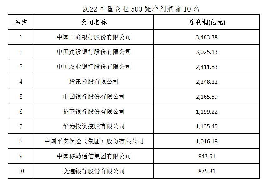 凈利潤前10名為工商銀行、建設(shè)銀行、農(nóng)業(yè)銀行、騰訊、中國銀行、招商銀行、華為、中國平安、中國移動、交通銀行。