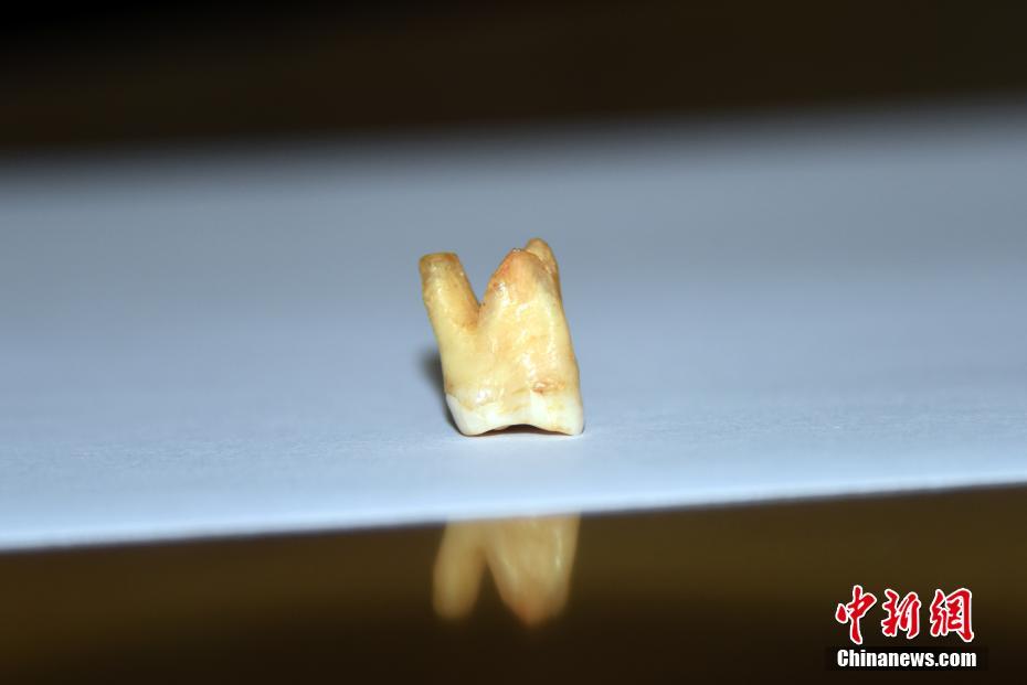 中國(guó)科學(xué)院古脊椎動(dòng)物與古人類(lèi)研究所(中科院古脊椎所)青年研究員吳妍帶領(lǐng)的研究團(tuán)隊(duì),通過(guò)對(duì)湖南道縣福巖洞遺址出土的、迄今所知東亞最早現(xiàn)代人(8-12萬(wàn)年前)的牙齒化石進(jìn)行牙結(jié)石提取與分析,最新研究發(fā)現(xiàn)東亞最早現(xiàn)代人植物類(lèi)食物的直接證據(jù),并發(fā)現(xiàn)當(dāng)時(shí)的古人類(lèi)就已經(jīng)有了剔牙行為。這項(xiàng)重要研究發(fā)現(xiàn)的成果論文,已在國(guó)際專(zhuān)業(yè)學(xué)術(shù)期刊《植物科學(xué)前沿》發(fā)表。圖為9月7日,北京,中科院古脊椎所標(biāo)本館,展示一顆用于本次研究的湖南道縣福巖洞遺址出土、8-12萬(wàn)年前東亞最早現(xiàn)代人牙齒化石標(biāo)本。 中新社記者 孫自法 攝