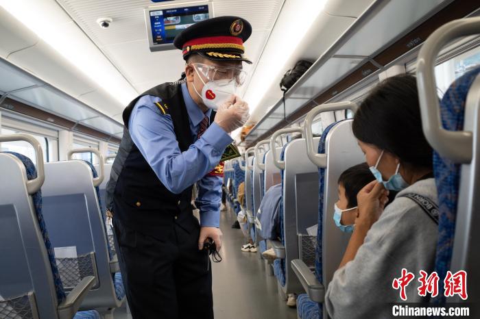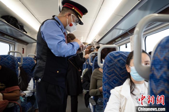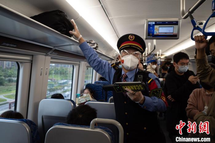 “請保管好自身財物,看管好小孩,照顧好老人,上下車注意腳下安全?!睌?shù)百名乘客陸續(xù)上車后,鐘靜開始在車廂里巡視。疫情防控期間,他要提醒大家戴好口罩。遇到行李架上行李擺放不規(guī)范,他要動手整理。同時,他還負責整列4節(jié)車廂的查票、補票工作。