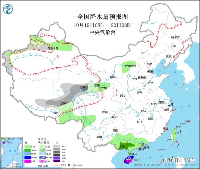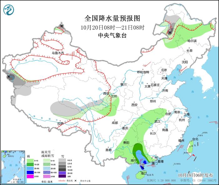 10月19日08時(shí)至20日08時(shí),新疆沿天山地區(qū)和南疆西部山區(qū)、西藏東北部、青海中南部等地部分地區(qū)有小到中雪,其中,西藏東北部、青海東部等地部分地區(qū)有大雪(5~8毫米)。廣西南部沿海、海南島等地部分地區(qū)有中到大雨,其中,海南島等地部分地區(qū)有暴雨或大暴雨(100~120毫米)。內(nèi)蒙古東南部、遼東半島、新疆南疆盆地、陜西中部、廣西東南部等地部分地區(qū)有4~6級(jí)風(fēng);臺(tái)灣海峽、南海北部和中西部偏北海域的風(fēng)力可達(dá)10~11級(jí)、陣風(fēng)12~13級(jí),臺(tái)風(fēng)中心經(jīng)過(guò)的附近海域風(fēng)力可達(dá)12~14級(jí)、陣風(fēng)15~16級(jí)。