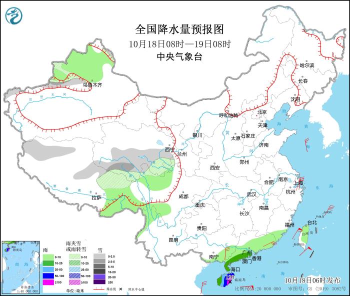 10月18日08時(shí)至19日08時(shí),新疆沿天山地區(qū)、西藏北部和西部、青海東部和南部等地部分地區(qū)有小到中雪或雨夾雪。廣東西南部、海南島等地部分地區(qū)有中到大雨,其中,海南島中東部部分地區(qū)有暴雨或大暴雨(100~120毫米)。黑龍江東北部、廣西東南部、廣東東南部沿海等地部分地區(qū)有4~6級(jí)風(fēng);臺(tái)灣海峽、南海北部和中西部偏北海域的風(fēng)力可達(dá)10~11級(jí)、陣風(fēng)12~13級(jí),臺(tái)風(fēng)中心經(jīng)過(guò)的附近海域風(fēng)力可達(dá)12~14級(jí)、陣風(fēng)15~16級(jí)。