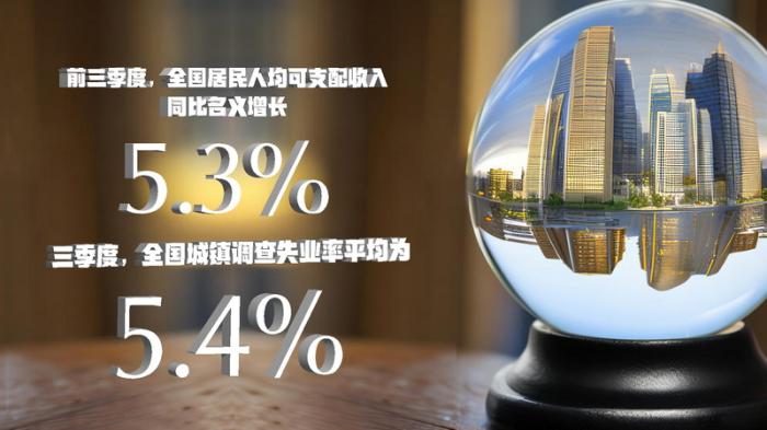 就業(yè)形勢總體穩(wěn)定,居民收入平穩(wěn)增長。前三季度,全國城鎮(zhèn)調(diào)查失業(yè)率平均為5.6%,其中三季度平均為5.4%,比二季度下降0.4個百分點。全國居民人均可支配收入27650元,同比名義增長5.3%;扣除價格因素實際增長3.2%,比上半年加快0.2個百分點;全國居民人均可支配收入中位數(shù)23277元,同比名義增長5.1%。