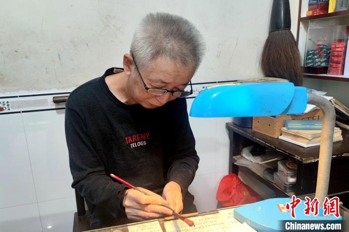藍田張氏毛筆制作技藝非遺傳承人張才枝在為剛做好的毛筆刻字?!枪跇恕z