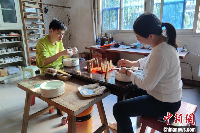 張才枝的兩個徒弟在學習制筆?!枪跇?攝