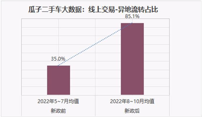 瓜子二手車大數(shù)據(jù)顯示,異地交易占比從8月前3個(gè)月的平均35%,攀升至8月起三個(gè)月的均值85%以上,提升超1.4倍。