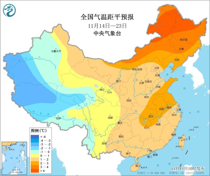 中新網(wǎng)11月14日電 據(jù)中央氣象臺(tái)網(wǎng)站消息,未來(lái)10天(11月14-23日),除新疆西部、青藏高原大部等地平均氣溫較常年同期偏低1~2℃,中東部大部地區(qū)偏高1~2℃,內(nèi)蒙古東部、東北地區(qū)中北部偏高3~4℃。未來(lái)10天,江南大部、華南西部及貴州等地累計(jì)降水量有25~40毫米,其中江南中南部及廣西中北部等地部分地區(qū)有50~80毫米、局部100毫米以上;上述地區(qū)降水量較常年同期偏多3~6成,局地偏多1倍以上;其余地區(qū)降水接近常年或偏少。