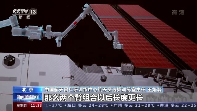 中國(guó)航天員科研訓(xùn)練中心航天員選拔訓(xùn)練室主任 王焰磊:我們首次使用兩個(gè)機(jī)械臂,就是大臂小臂形成組合臂的狀態(tài)下支持出艙活動(dòng)任務(wù)。因?yàn)榇蠹铱梢韵胂笠幌?,單臂的長(zhǎng)度已經(jīng)很長(zhǎng)了,那么兩個(gè)臂組合以后長(zhǎng)度更長(zhǎng),它的柔性、剛性等和我們單臂狀態(tài)下是有一些區(qū)別的。在這種情況下載人去支持完成出艙任務(wù),也是我們做首次的一個(gè)驗(yàn)證。