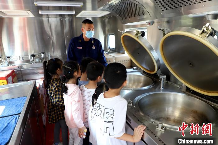 消防員帶領小朋友們參觀炊事車。 蔡增欣 攝