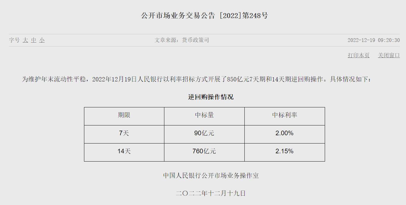 中新網(wǎng)12月19日電 據(jù)央行官網(wǎng)19日消息,為維護(hù)年末流動(dòng)性平穩(wěn),2022年12月19日人民銀行以利率招標(biāo)方式開展了850億元7天期和14天期逆回購(gòu)操作。(中新財(cái)經(jīng))