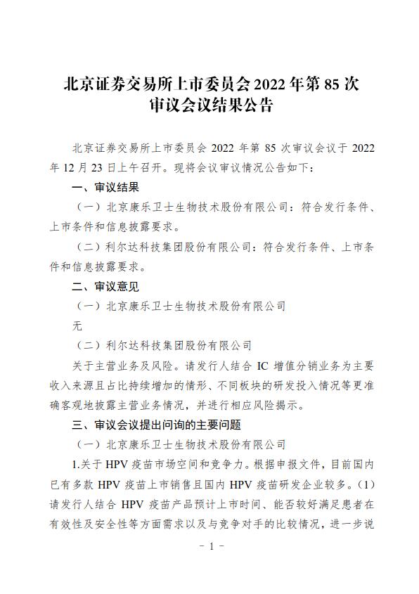 中新網(wǎng)12月26日電 北京證券交易所網(wǎng)站消息,北京證券交易所上市委員會2022年第85次審議會議于2022年12月23日上午召開。審議結(jié)果顯示,北京康樂衛(wèi)士生物技術(shù)股份有限公司、利爾達科技集團股份有限公司符合發(fā)行條件、上市條件和信息披露要求。