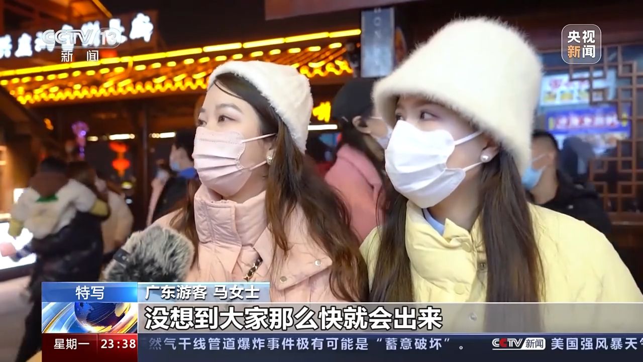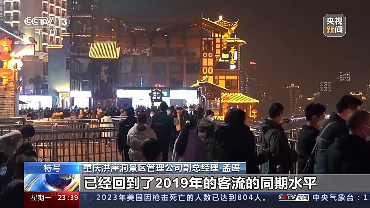 重慶洪崖洞景區(qū)管理公司副總經(jīng)理 孟瑤:本來按照我們的預估,可能會在今年的二到三月份,游客量會有一個明顯的回升。元旦的第一天和第二天,我們的客流分別已經(jīng)達到了6.4萬和6.2萬,已經(jīng)回到了2019年的客流的同期水平,甚至已經(jīng)超過了17%。
