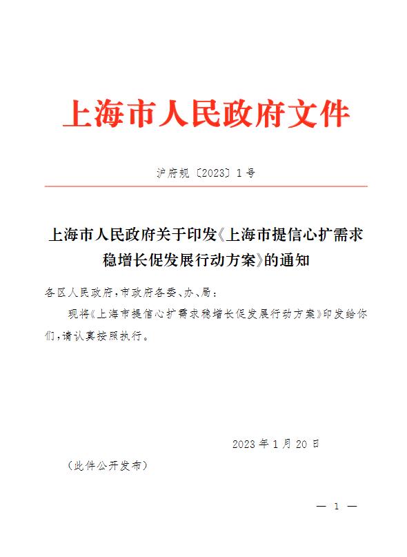 中新網(wǎng)1月29日電 據(jù)上海發(fā)布微信公眾號(hào)29日消息,為全面貫徹黨的二十大和中央經(jīng)濟(jì)工作會(huì)議精神,落實(shí)市第十二次黨代會(huì)和十二屆市委二次全會(huì)部署,抓牢高質(zhì)量發(fā)展首要任務(wù),大力提振市場(chǎng)預(yù)期和信心,推動(dòng)經(jīng)濟(jì)社會(huì)發(fā)展開好局起好步,近期上海市制定了《上海市提信心擴(kuò)需求穩(wěn)增長(zhǎng)促發(fā)展行動(dòng)方案》(以下簡(jiǎn)稱《行動(dòng)方案》)。
