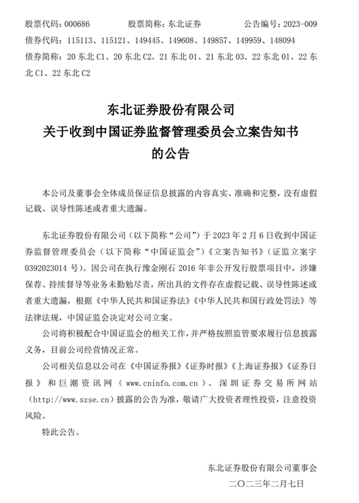 中新網(wǎng)2月7日電 7日,東北證券發(fā)公告稱,東北證券股份有限公司于2023年2月6日收到中國證券監(jiān)督管理委員會(huì)《立案告知書》(證監(jiān)立案字 0392023014 號(hào))。因公司在執(zhí)行豫金剛石2016年非公開發(fā)行股票項(xiàng)目中,涉嫌保薦、持續(xù)督導(dǎo)等業(yè)務(wù)未勤勉盡責(zé),所出具的文件存在虛假記載、誤導(dǎo)性陳述或者重大遺漏,根據(jù)相關(guān)法律法規(guī),中國證監(jiān)會(huì)決定對公司立案。(中新財(cái)經(jīng))