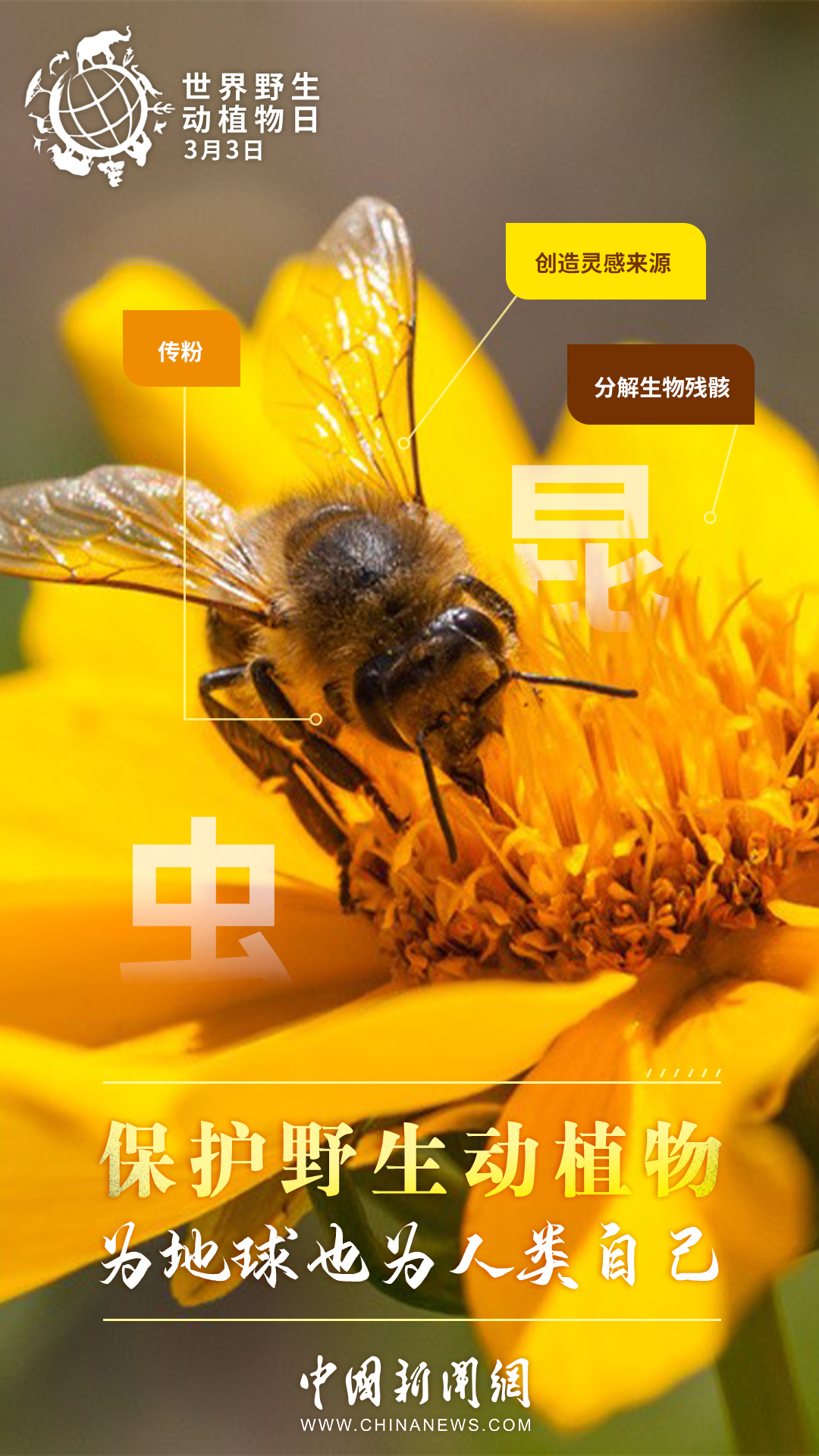 世界約80%的農作物都依賴蜜蜂等蟲媒傳粉,一座鯨的尸體可以供養(yǎng)一套以分解者為主的循環(huán)系統(tǒng)長達百年……其實,大自然里的每種生物都有它存在的價值。今天是第十個“世界野生動植物日”,戳圖了解它們的作用,一起來保護野生動植物。