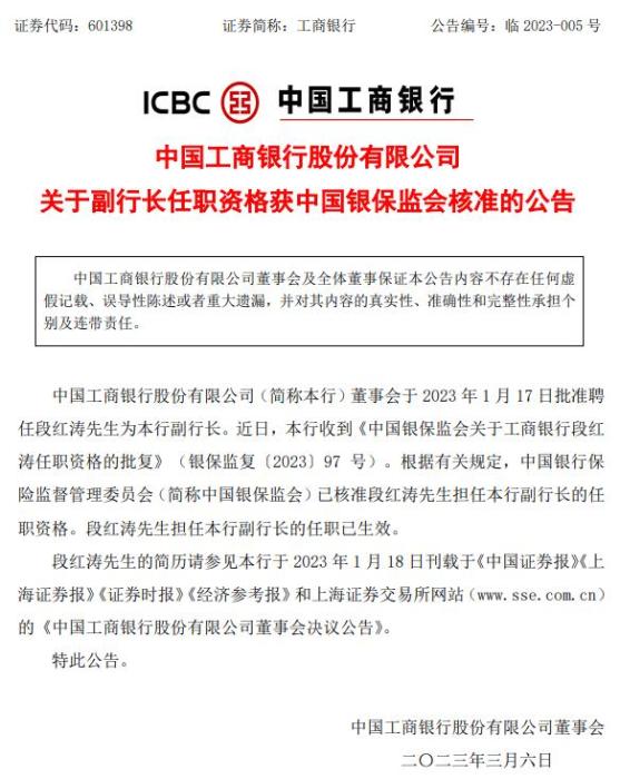 工商銀行6日發(fā)布公告稱,董事會于2023年1月17日批準(zhǔn)聘任段紅濤為副行長。近日,工商銀行收到《中國銀保監(jiān)會關(guān)于工商銀行段紅濤任職資格的批復(fù)》。根據(jù)有關(guān)規(guī)定,中國銀保監(jiān)會已核準(zhǔn)段紅濤擔(dān)任工商銀行副行長的任職資格。段紅濤先生擔(dān)任工商銀行副行長的任職已生效。