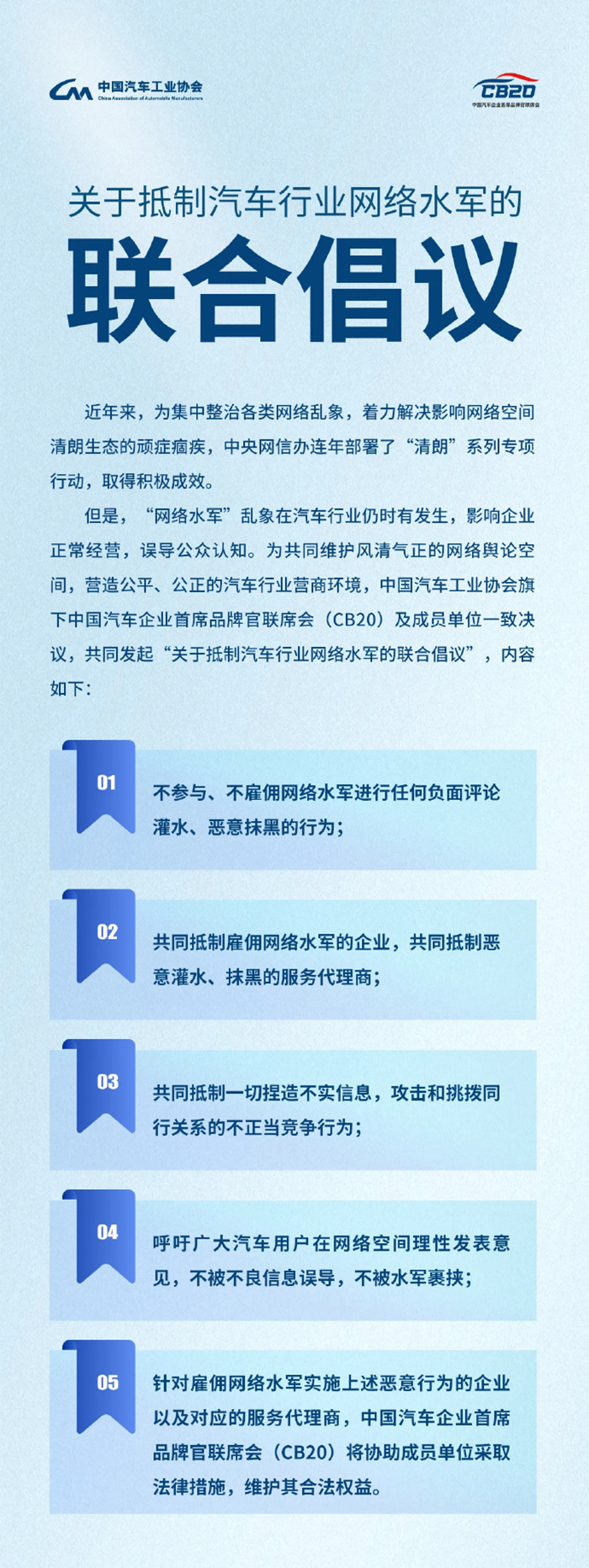 5、針對(duì)雇傭網(wǎng)絡(luò)水軍實(shí)施上述惡意行為的企業(yè)以及對(duì)應(yīng)的服務(wù)代理商,中國(guó)汽車企業(yè)首席品牌官聯(lián)席會(huì)(CB20)將協(xié)助成員單位采取法律措施,維護(hù)其合法權(quán)益。(完)