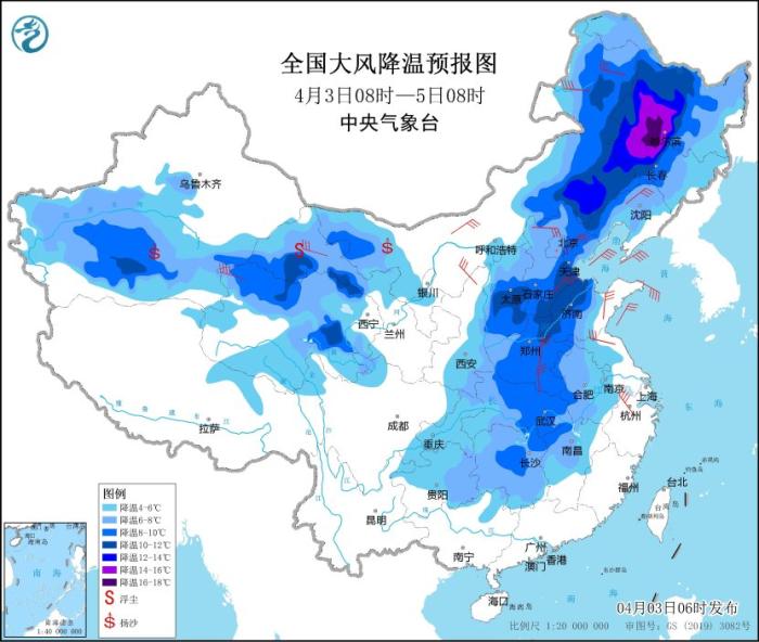 受較強冷空氣影響,4月3日08時至5日08時,新疆南疆盆地、西北地區(qū)中部、內(nèi)蒙古西部和東北部、華北、東北地區(qū)、黃淮、江漢、江淮中西部、江南中西部等地氣溫將下降4~8℃,其中,內(nèi)蒙東北部、東北地區(qū)西部、華北南部等地局地降溫幅度可達10℃以上;上述部分地區(qū)并有5~6級偏北風,陣風7~9級。新疆南部和東部、內(nèi)蒙古西部、甘肅西部等地有沙塵天氣(見圖1)。3日夜間,渤海、黃海西南部海域、東海西北部海域、長江口附近海域?qū)⒂?級、陣風9級的大風,其中渤海灣將有9級、陣風10級的大風。中央氣象臺4月3日06時繼續(xù)發(fā)布大風降溫預報和海上大風黃色預警。