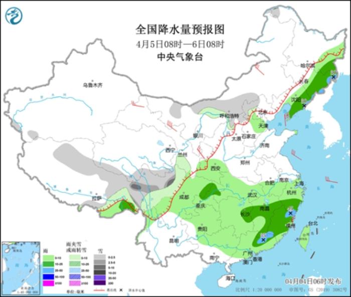 圖4 全國降水量預(yù)報圖(4月5日08時-6日08時)