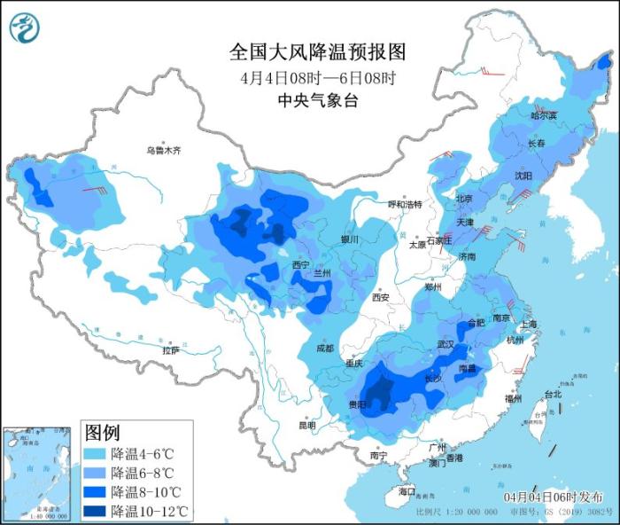 圖2 全國大風(fēng)降溫預(yù)報圖(4月4日08時至6日08時)