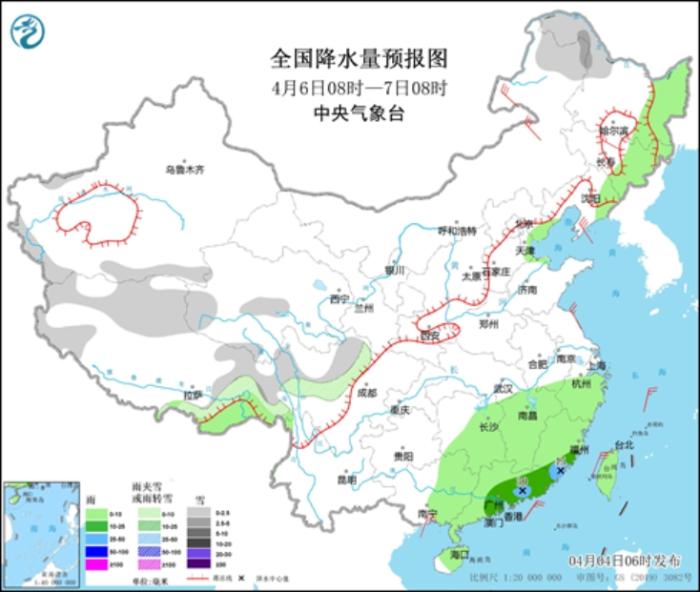 4月6日08時至7日08時,內(nèi)蒙古東北部、黑龍江西北部、新疆南疆盆地和南疆西部山區(qū)、西藏北部和東部、青海南部、川西高原北部等地部分地區(qū)有小雪或雨夾雪,局地有中雪。東北地區(qū)東部、西藏東南部、河北東北部、天津東部、江南中東部、華南大部、臺灣島等地部分地區(qū)有小到中雨,其中,福建東南部、廣東東南部等地局地有大雨(25~45毫米)。內(nèi)蒙古東北部和中部、吉林中部等地部分地區(qū)有4~6級風(fēng)(見圖5)。渤海、渤海海峽、黃海北部海域?qū)⒂?~7級、陣風(fēng)8級的偏北風(fēng)。