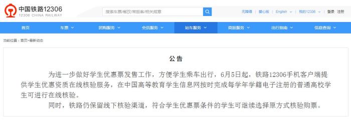 中新網(wǎng)6月5日電 中國鐵路12306網(wǎng)站6月5日發(fā)布公告稱,為進一步做好學(xué)生優(yōu)惠票發(fā)售工作,方便學(xué)生乘車出行,6月5日起,鐵路12306手機客戶端提供學(xué)生優(yōu)惠資質(zhì)在線核驗服務(wù),在中國高等教育學(xué)生信息網(wǎng)按時完成每學(xué)年學(xué)籍電子注冊的普通高校學(xué)生可進行在線核驗。