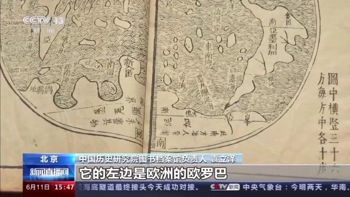 中國歷史研究院圖書檔案館負(fù)責(zé)人 袁立澤:這幅圖是16世紀(jì)末,西方第一批來華傳教士利瑪竇主持繪制的。把西方當(dāng)時先進(jìn)的制圖技術(shù)帶到了中國,同時他有意識地吸收了中國的制圖經(jīng)驗和理念。今天我們所熟悉的七大洲四大洋,在圖中應(yīng)該說已經(jīng)標(biāo)示出了六大洲和三大洋,就是亞洲的亞細(xì)亞。它的左邊是歐洲的歐羅巴,南面就是今天的非洲叫利未亞,改變了以往以歐洲為中心的繪圖方式。它是中西文明交流互鑒的一個結(jié)晶和有力見證。