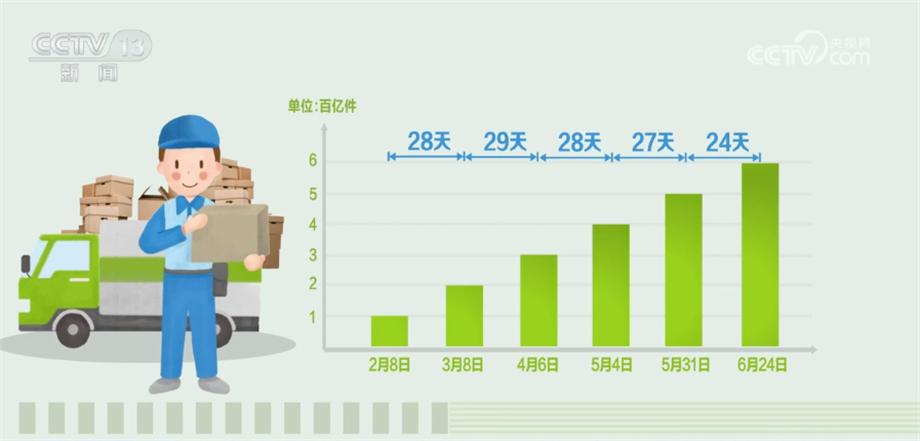 今年以來(lái),從2月8日我國(guó)快遞業(yè)務(wù)量超100億件起,每個(gè)月快遞業(yè)務(wù)量都以百億件為增量。28天,快遞業(yè)務(wù)量從100億件到200億件(3月8日),29天達(dá)300億件(4月6日),28天從300億件到400億件(5月4日),27天達(dá)500億件(5月31日),從500億件到600億件(6月24日)只花了24天。