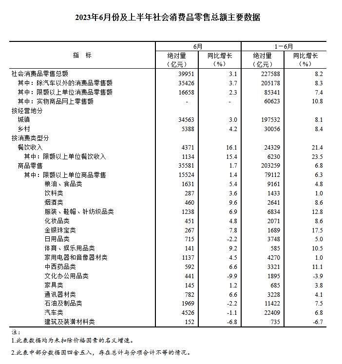 6月份,社會消費(fèi)品零售總額39951億元,同比增長3.1%。