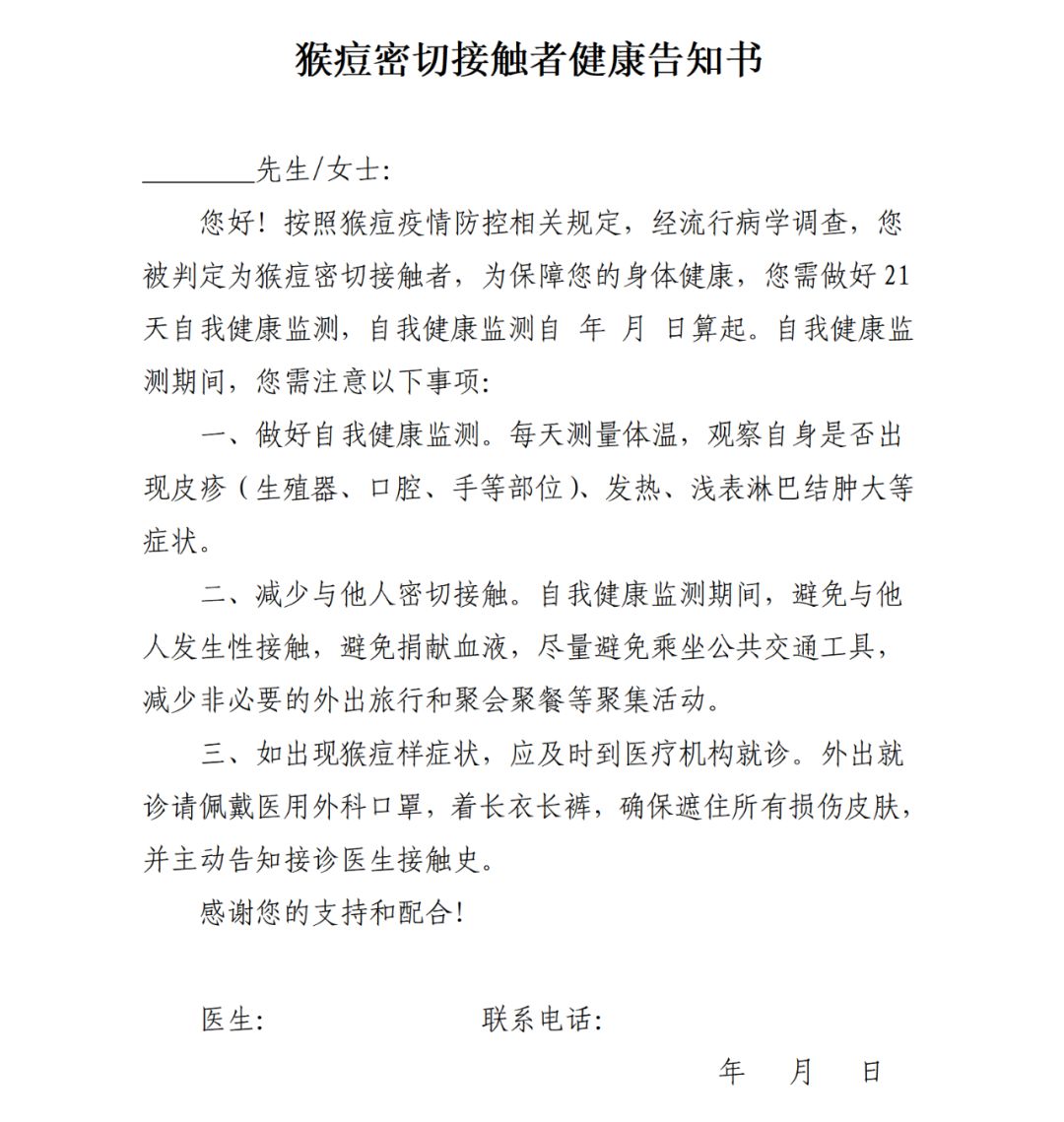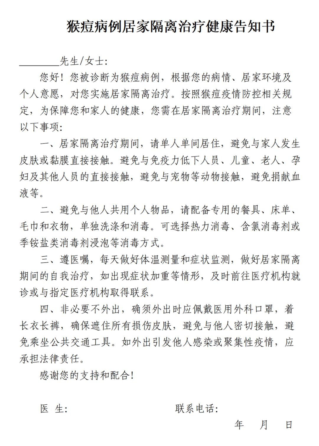 各地發(fā)現(xiàn)猴痘疑似病例和確診病例應當及時轉(zhuǎn)運至醫(yī)療機構(gòu)進行隔離治療,如臨床癥狀明顯好轉(zhuǎn),病變部位已結(jié)痂,可轉(zhuǎn)為居家隔離治療,直至皮疹結(jié)痂自然脫落,解除居家隔離。對病情較輕且具備居家隔離治療條件的確診病例,經(jīng)醫(yī)療機構(gòu)與疾控機構(gòu)聯(lián)合評估后,可直接采取居家隔離治療。對于實行居家隔離治療的確診病例發(fā)放《猴痘病例居家隔離治療健康告知書》(見附件2)。確診病例居家隔離治療期間,單人單間居住,避免與家人有皮膚或黏膜直接接觸,做好被污染物品的消毒,非必要不外出,確須外出時穿長衣長褲、佩戴醫(yī)用外科口罩,避免前往人群聚集場所,避免與其他人有皮膚或黏膜直接接觸;指定醫(yī)療機構(gòu)安排專人負責上門或電話隨訪,提供健康咨詢和醫(yī)療指導。