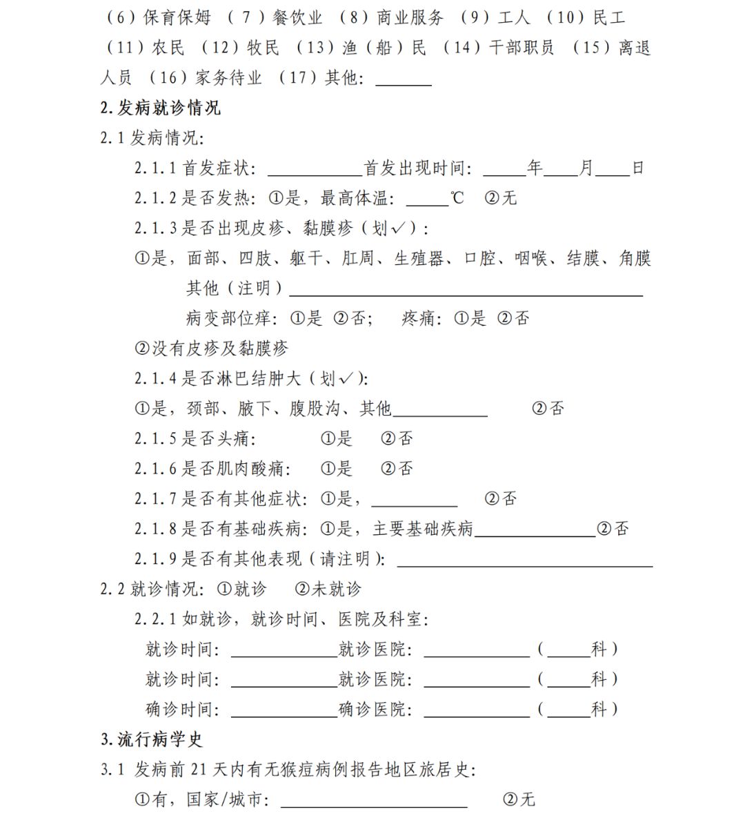 2.疑似病例。猴痘樣癥狀者,發(fā)病前21天內(nèi)具備以下流行病學史中的任何一項:(1)有猴痘病例報告地區(qū)旅居史;(2)有猴痘確診病例或疑似病例接觸史;(3)有同性性行為,或性伴有同性性行為史;(4)有地方性流行區(qū)可疑動物接觸史。